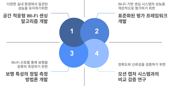 본 연구에서는 공간 적응형 Wi-Fi 인식 기술을 개발하고, 다양한 실험 조건에서의 오차율을 체계적으로 기록하여 Wi-Fi를 통한 사람의 상태 및 활동 인식 연구에서 활용할 수 있는 방법론을 제안하고자 한다. 또한, 단순한 방법론의 제안에 그치지 않고 보행 사례에 초점을 맞추어, 주요 보행 관련 지표 인식의 정확도와 신뢰성을 향상시키기 위한 알고리즘 및 프로토콜을 개발함으로써 방법론의 유용성을 검증할 예정이다.